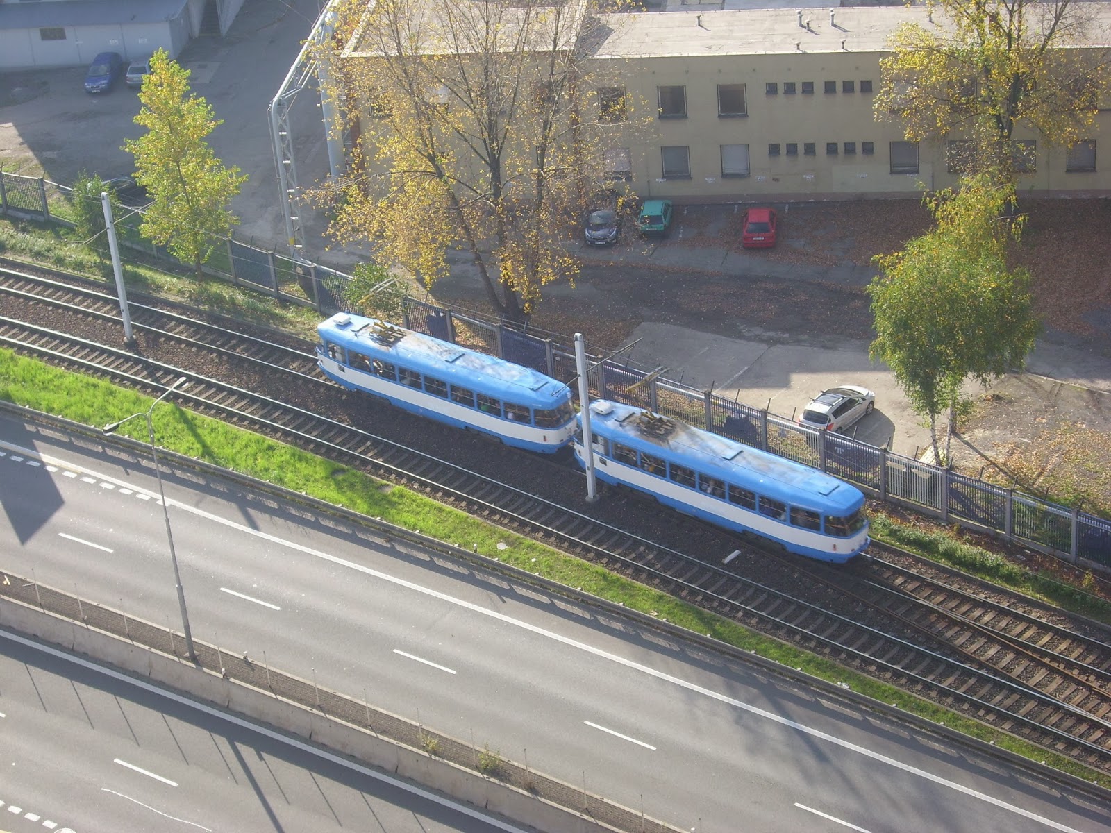 | Skład Tatr T3 widziany z góry kieruje się na południe, w kierunku Dubiny. |