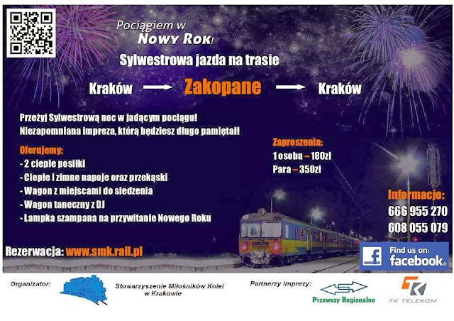 Tegoroczny pociąg sylwestrowy wyruszy około 19.00 do Zakopanego. Impreza zakończy się nad ranem na Dworcu Głównym w Krakowie. Cena za tę przyjemność do 180 zł za osobę lub 350 zł za parę. W cenie zawierają się: