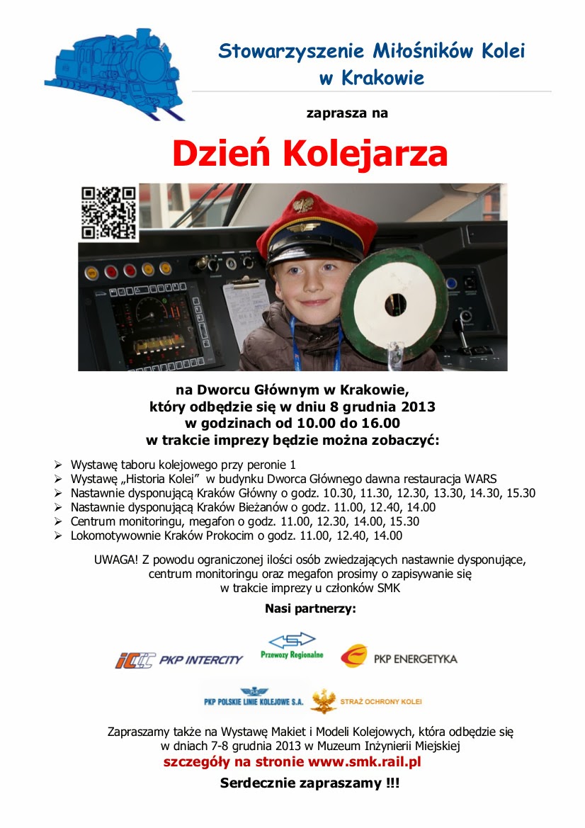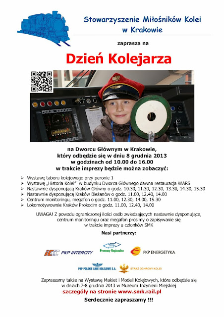 W najbliższą niedzielę, 8 grudnia, przypadają w Krakowie obchody Święta Kolejarza. Impreza odbywać się będzie zasadniczo na krakowskim Dworcu Głównym, jednakże zaplanowano także zwiedzanie budynków i pomieszczeń kolejowych rozlokowanych nieco dalej. Organizatorem imprezy jest Stowarzyszenie Miłośników Kolei, przy wsparciu i udziale Przewozów Regionalnych, PKP Intercity, PKP Energetyka, SOK i PKP PLK. Impreza trwać będzie w godzinach 10.00 - 16.00.