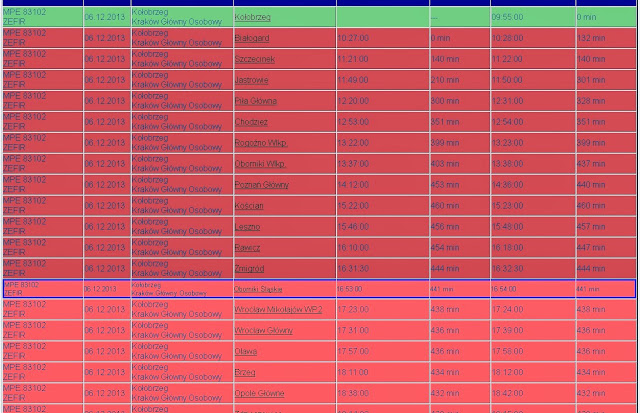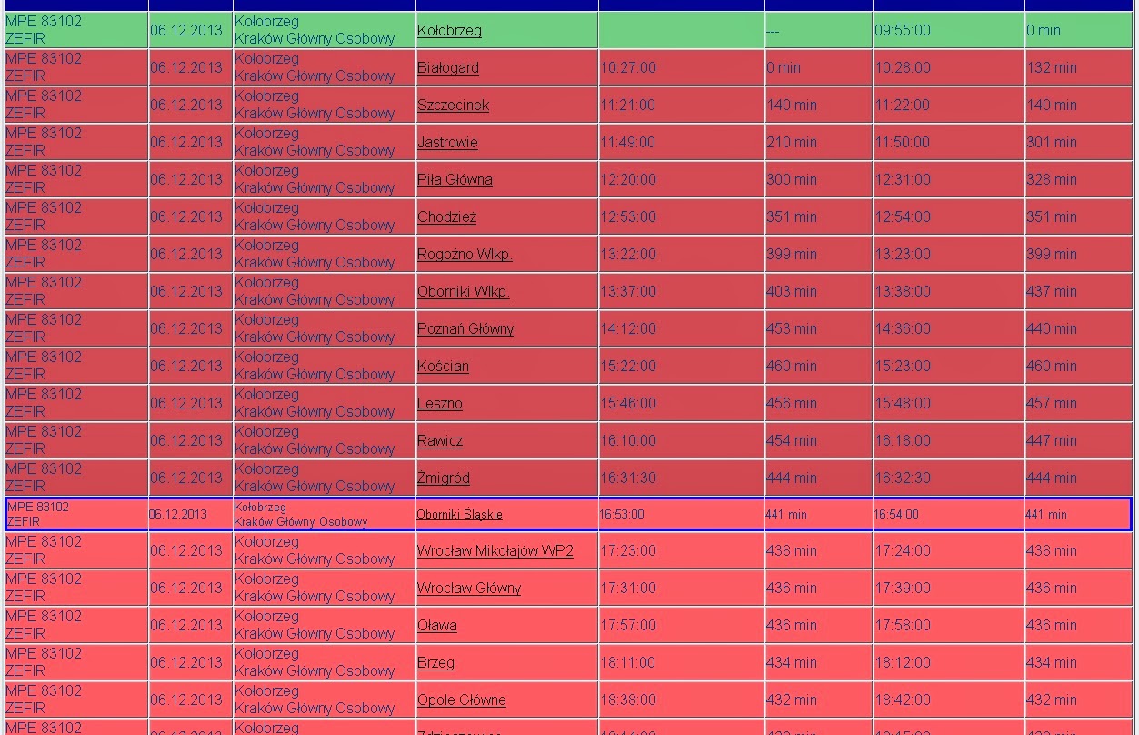 | Przebieg opóźnień pociągu TLK ZEFIR rel. Kołobrzeg - Kraków Główny z godziny 00:00 |