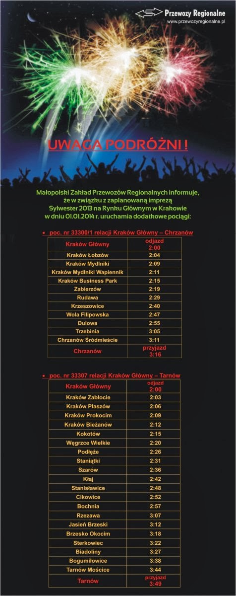 P.S. Z uwagi na fakt, że dnia 1 stycznia pociąg Regio do Katowic (odj. z Kraków Główny o 3:40) nie kursuje, w pociągu "sylwestrowym" może być ciekawie :)