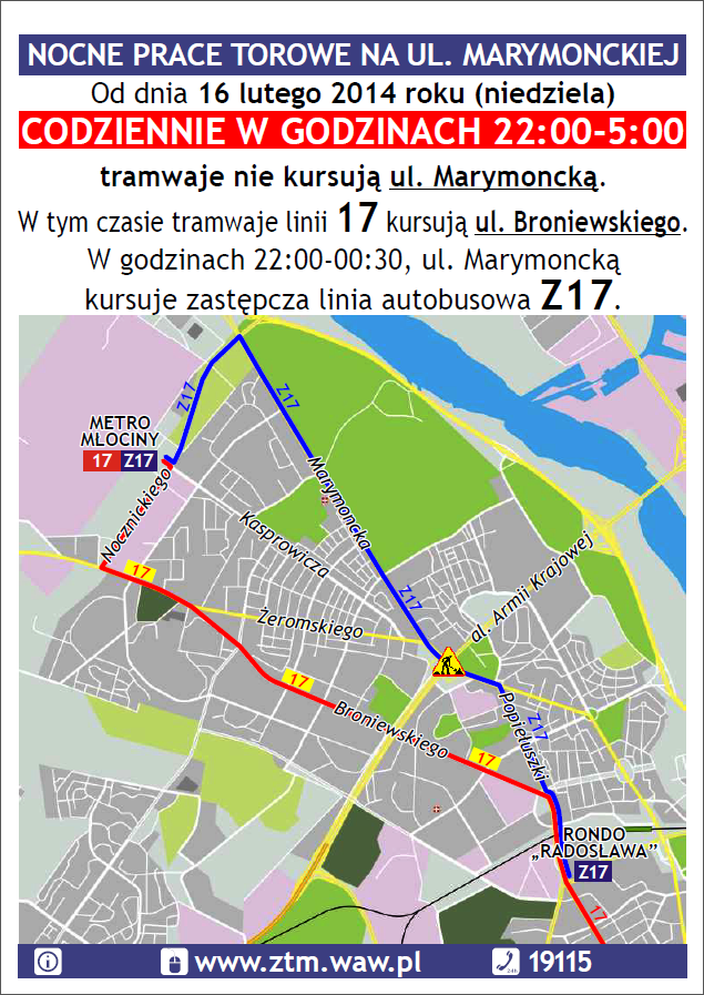 W związku ze zmianą tras linii tramwajowych od nocy 16/17.02.2014 r. uruchomiona zostanie autobusowa linia zastępcza Z17 kursująca codziennie w ramowych godzinach 22:00 – 00:30 wg specjalnego rozkładu jazdy na trasie: