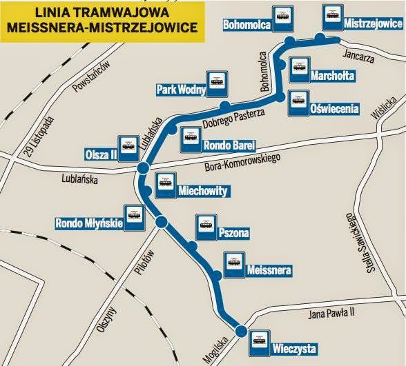 Przypomnę, że pierwotnie tramwaj z Mistrzejowic do centrum miał pojechać w okolicach Osiedla Oświecenia i dalej do Ronda Polsadu, następnie przez starą Olszę, pod torami kolejowymi do pętli przy Cmentarzu Rakowickim. Ostatecznie jednak, jeżeli już dojdzie do budowy, tramwaje pojadą od Wieczystej, przez Rondo Młyńskie i Rondo Polsadu, dalej przez Park Wodny i Bohomolca do pętli w Mistrzejowicach. Jeżeli nic nie zakłóci przebiegu przygotowań, inwestycja może rozpocząć się już w 2018 roku - informuje Gazeta.