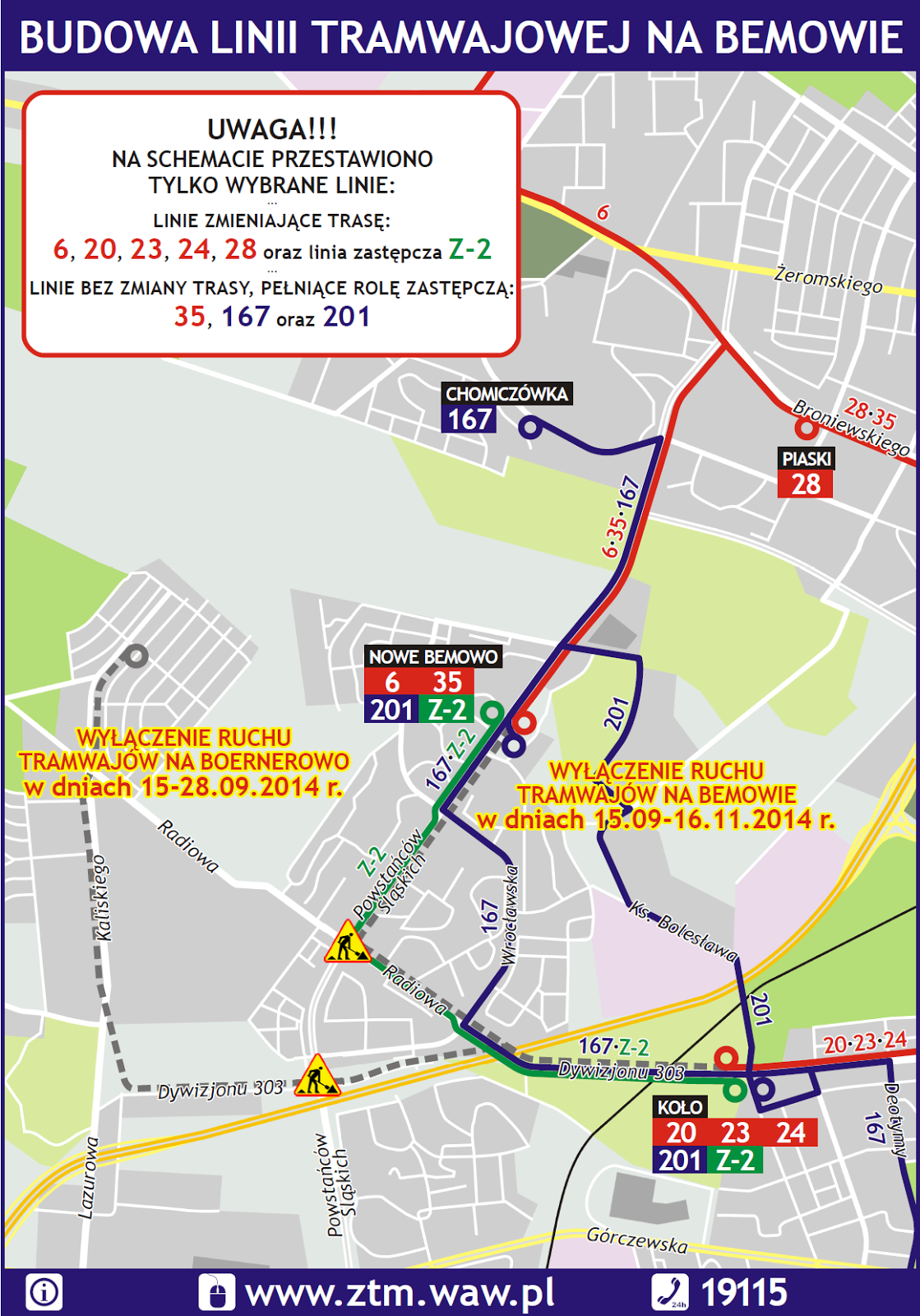 Od poniedziałku, 15 września, do 17 listopada, wyłączony będzie ruch tramwajowy między pętlami Koło i Nowe Bemowo. Dodatkowo, do dnia 29 września wyłączona będzie także trasa do Boernerowa (linia 20). Jest to związane z zabudową rozjazdów dla nowej trasy tramwajowej, łączącej Bemowo i Jelonki. W związku z tym wprowadzone zostaną następujące zmiany: