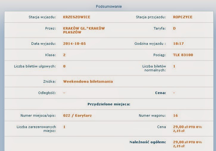 Kiedy już zalogowaliśmy się, zarejestrowaliśmy nasze konto w systemie, dostajemy ekran z parametrami naszego biletu. Widać na nim klasę, wagon, miejsce, a także numer pociągu i relację, w której podróżujemy. Pod tabelą znajdują się opcje zapłaty.Płatności można dokonać przelewem z konta (przelewy24), kartą kredytową (obsługuje eCard), oraz odłożyć ją na później. Płatność przeprowadzana jest zgodnie z instrukcjami operatora i wybranego przez nas banku.