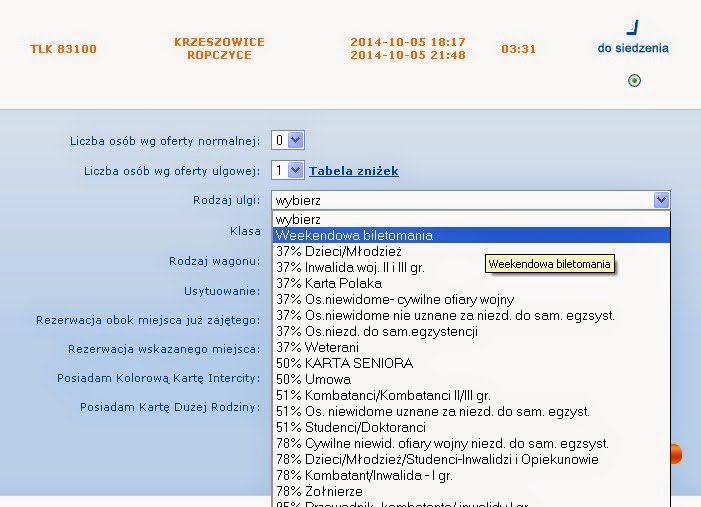 Następnym krokiem jest ustawienie parametrów naszego biletu. Ustalamy więc, ile biletów na daną trasę kupujemy, wybierając ilości z list rozwijanych. Określamy ulgi, wybieramy opcjonalnie rodzaj wagonu i usytuowanie miejsca (opcja ta ostatnimi czasy nagminnie nie działa). Podajemy imię i nazwisko podróżnego, posługującego się biletem i gotowe!WAŻNE: