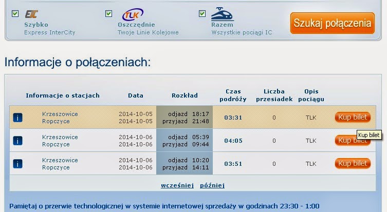 Po wpisaniu relacji i ustaleniu parametrów wyjazdu, z listy wybrać należy pociąg, który nas interesuje. Jest jedna wada - dostępne są tylko relacje bezpośrednie. Na przejazd łączony trzeba składać bilety z poszczególnych odcinków. Klikamy ikonę "Kup bilet" obok wybranego połączenia.KROK 3 - Ustawienie parametrów przejazdu
