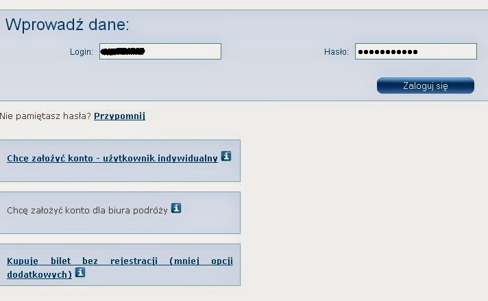 Teraz czas na logowanie do systemu. Jeżeli nie mamy konta, należy wybrać opcję zarejestruj się jako osoba indywidualna. Polecam ten sposób współpracy z systemem, gdyż udostępnia nam on wiele możliwości. Istnieje możliwość zakupu biletu bez rejestracji, z ograniczonymi funkcjonalnościami. Rejestrację przeprowadzamy zgodnie ze wskazówkami systemu.