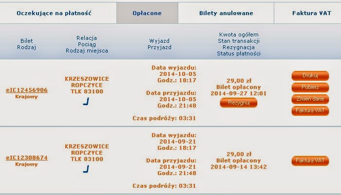 Po dokonanej płatności przenosimy się do listy wybranych biletów. Tam istnieje możliwość bezpośredniego zamówienia faktury VAT, wydruku biletu oraz jego anulowania przez rozpoczęciem się terminu ważności (czyli przed dniem wyjazdu). Bilety przychodzą ponadto mailem na adres, podany w trakcie rejestracji w serwisie e-IC.Wszystkim życzę udanych podróży!