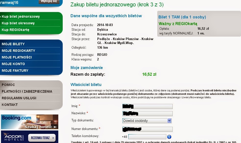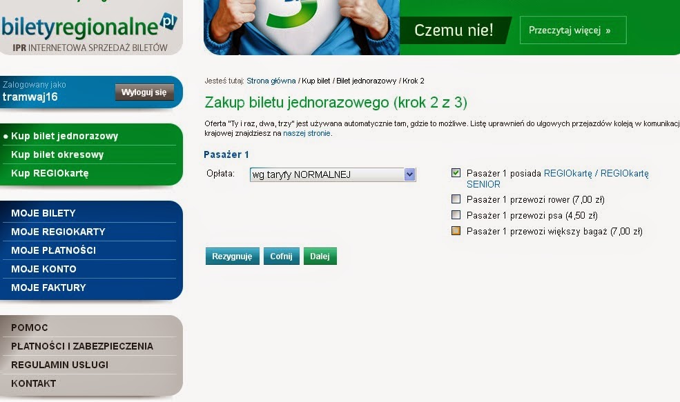Po ułożeniu trasy przejazdu i przejściu dalej, pojawia się ekran wyboru ulg i parametrów biletu. Można tam zaznaczyć chęć doliczenia biletu dla psa, dużego bagażu czy roweru, wybrać rodzaj biletu i ulgi, a także zaznaczyć pole dla posiadaczy REGIOKart.Dokonujemy kontroli parametrów naszego biletu, zgodności danych, i poznajemy ostateczną cenę: