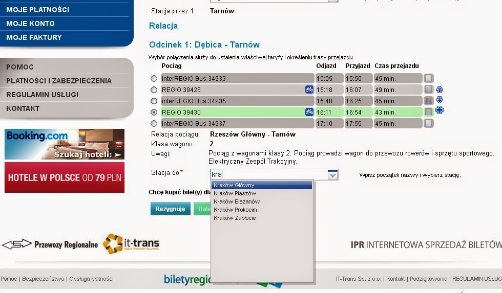 Warto zauważyć, że system, w zależności od naszych wyborów, sam wyświetla wszystkie dostępne połączenia, z których należy wybrać zaznaczając wybrane kółko po lewej stronie nazwy i numeru pociągu.