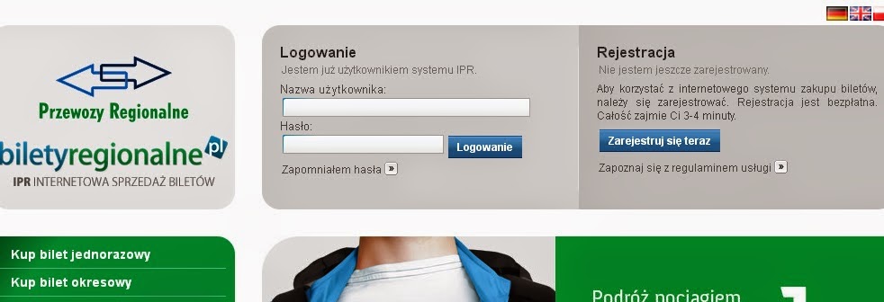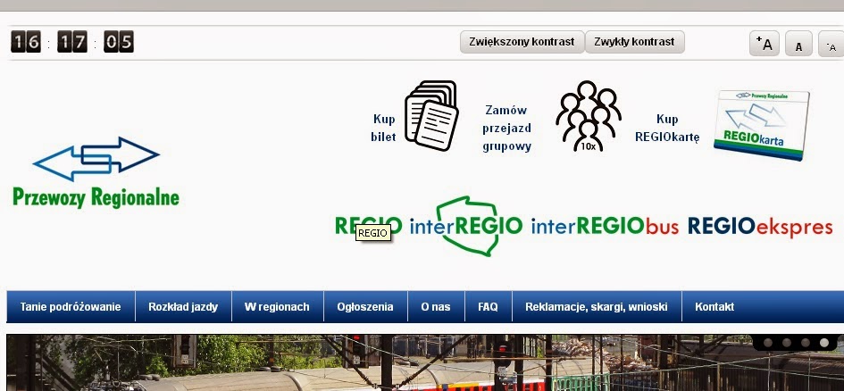 Wchodząc na stronę główną Przewozów Regionalnych, na samej górze mamy trzy ikony, umożliwiające przejście do systemu zakupu biletów, zamawiania przejazdów grup oraz zamawiania REGIOKarty. Klikamy pierwsze okno: