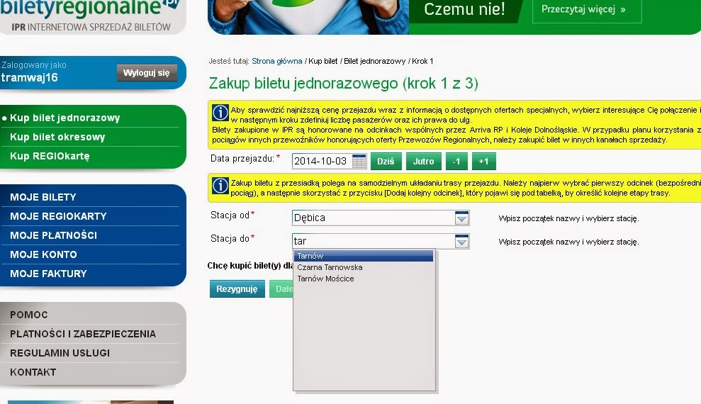Kliknięcie w ikonę "Kup bilet" przenosi nas do systemu iPR, gdzie postępujemy według następujących kroków.