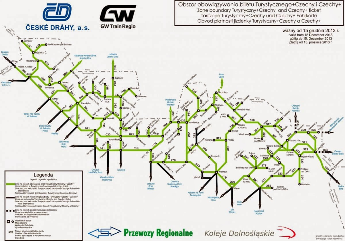 Bilet Czechy + łącznie z biletem do niego wydanym jest ważny w kl. 2 na przejazdy pociągami PR od/do stacji granicznej na kolejowym przejściu granicznym z Republiką Czeską do punktu granicznego a także w pociągach uruchamianych w Czechach na wybranych trasach przez ČD oraz GW Train Regio a.s.