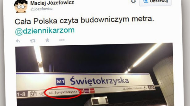 A propos Świętokrzyskiej: projektantom i wykonawcom nie udało się ustrzec przed błędami. Na Twitterze Macieja Józefowicza pojawiło się zdjęcie, obrazujące błąd językowy - zamiast Świętokrzyskiej jest Święktorzyska.