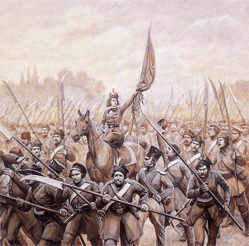 | Emilia Plater przewodzi kosynierom na XIX-wiecznym obrazie Jana Rosena (pl.wikipedia.org) |