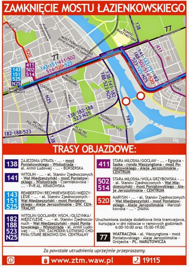 Od jutra ponadto wprowadzone zostaną zaawansowane zmiany w komunikacji miejskiej w związku z zamknięciem Mostu Łazienkowskiego, opisane poniżej (komunikat ZTM Warszawa w całości):