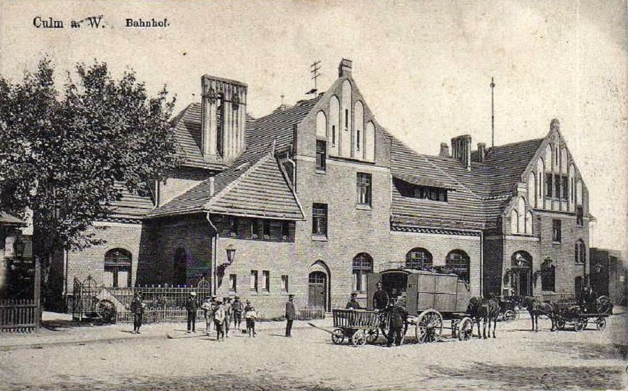 | Dworzec w Chełmnie na pocztówce z początków XX wieku (fotopolska.eu) |