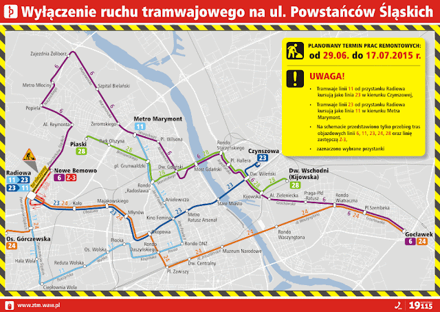 W poniedziałek, 29 czerwca, zostanie wyłączony ruch tramwajowy na Bemowie, na Powstańców Śląskich. Tramwaje nie będą kursowały między Radiową a pętlą Nowe Bemowo. Wrócą dopiero 18 lipca. W czasie wyłączenia pięć linii tramwajowych zostanie skierowanych na trasy objazdowe. Na ulice wyjedzie też zastępcza linia autobusowa. Zaplanowano następujące zmiany:
