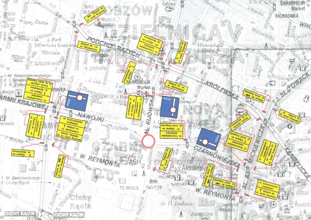 - AGH, Plac Inwalidów (w kierunku Azorów na ul. Królewskiej, za skrzyżowaniem z ul. Sienkiewicza, w kierunku Centrum Kongresowego na al. Mickiewicza).