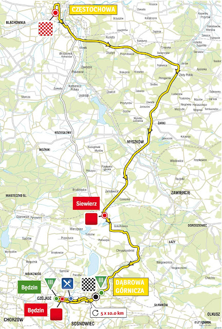 W Będzinie trasa wyścigu prowadzić będzie ulicami: aleją Kołłątaja, nerką „Będzińską”, Czeladzką, 9 Maja (Premia Górska), Chmielewskiego, Piłsudskiego, 11 Listopada (Premia Lotna), Zawale. Wyjazd w kierunku Dąbrowy prowadzić będzie na powrót aleją Kołłątaja.