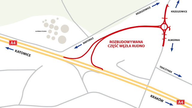 Budowa uzupełnienia niekompletnego Węzła Rudno w ciągu autostrady A4 staje się faktem. Obecnie Węzeł Rudno umożliwia zjazd z A4 z kierunku Katowic na drogę powiatową Krzeszowice - Alwernia oraz wjazd na autostradę w kierunku Krakowa. Dzięki inwestycji, do węzła po północnej stronie autostrady, zostaną dobudowane łącznice oraz rondo umożliwiające zjazd z autostrady od strony Krakowa oraz wjazd na A4 w stronę Śląska.