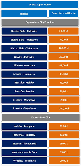 Bilety w ramach oferty Super Promo są dostępne na przejazdy w klasie 1. i 2. Oferta jest limitowana. Bilety można nabywać w całym okresie przedsprzedaży - najwcześniej na 30 dni przed terminem podróży, aż do wyczerpania limitu. Po wyprzedaniu puli najtańszych biletów ceny naliczane są z rabatami 30%, 20% i 10%.