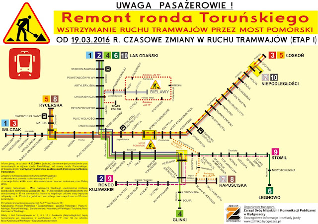 W związku z prowadzonymi pracami na rondzie Toruńskim od strony ronda Fordońskiego, wstrzymany całkowicie zostanie ruch tramwajów przez Most Pomorski.