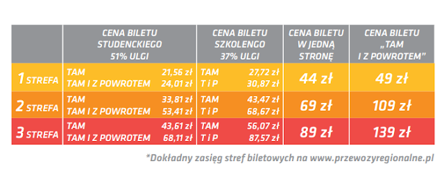 Cennik oraz zasięg stref przedstawiają poniższe infografiki, przygotowane przez zespół Przewozów Regionalnych: