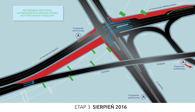 Etap 3, rozpoczynający się w poniedziałek, 8 sierpnia, będzie się wiązał z utrudnieniami w ruchu samochodów. Ruch od strony Podgórza zostanie w całości skierowany estakadą Obrońców Lwowa. Kierowcy nie dojadą zatem do skrzyżowania ulic Wielickiej i Powstańców Wielkopolskich i nie będą mogli na nim skręcić. Z kolei dojazd do skrzyżowania od strony Nowej Huty będzie dopuszczony, ale ze zwężeniem obejmującym dwa pasy ruchu. Jeden skrajny pas będzie przeznaczony dla autobusów.