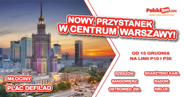 PolskiBus z dniem 15 grudnia wprowadza dla swoich klientów nowy przystanek w samym centrum Warszawy, a mianowicie na samym Placu Defilad! Autokary kursujące na dwóch trasach: Warszawa – Radom – Ostrowiec Świętokrzyski – Rzeszów oraz Warszawa – Radom – Skarżysko Kamienna – Kielce będą teraz zatrzymywać się w dwóch nowych, dogodnych lokalizacjach: na dworcu Metro Młociny oraz na Placu Defilad. Ponadto Pasażerowie będą mieć do dyspozycji jeszcze więcej możliwości podróżowania pomiędzy stolicą a Rzeszowem, poprzez włączenie dwóch kursów, które dotychczas kończyły się w Sandomierzu. Dzięki temu podkarpacka linia będzie oferowała aż 7 połączeń dziennie w każdą stronę.