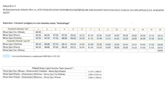 Nowosądeckie plany kolejowe wiążą się z niczym innym jak z przebudową połączenia drogowego między centrum a Chełmcem oraz budowy nowego mostu przez Dunajec. Inwestycja potrwa wiele miesięcy, częściowo paraliżując możliwość sprawnego poruszania się w obrębie miasta. Dobrym wyjściem będzie właśnie uruchomienie wspomnianych kursów szynobusu, o ile się oczywiście uda. Finansowanie przewozów mają zapewnić Miasto Nowy Sącz, powiat nowosądecki oraz Urząd Marszałkowski Województwa Małopolskiego. Rozkład zaplanowany przez MPK Nowy Sącz wygląda następująco: