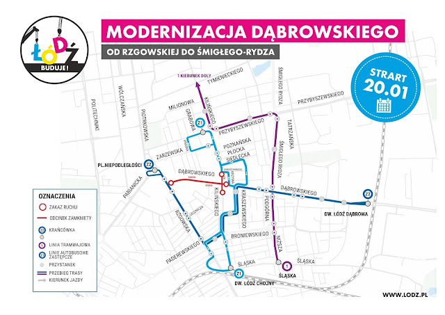 Prace zostały podzielone na etapy. 20 stycznia rozpocznie się przebudowa skrzyżowania Kilińskiego – Dąbrowskiego oraz odcinka Rzgowska – Kilińskiego, jednak na razie bez skrzyżowania z Rzgowską. W tym etapie zaplanowano następujące zmiany w komunikacji miejskiej: