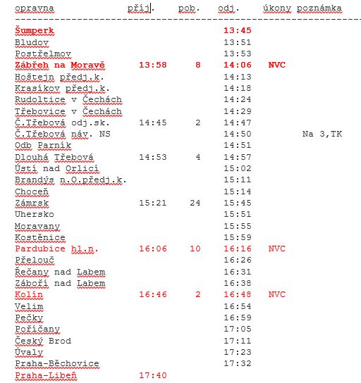 Dzień wcześniej jednak, bo w piątek 10 sierpnia, Koleje Czeskie uruchomią specjalny pociąg pożegnalny na trasie Šumperk - Praha-Libeň. Przejazd odbywać się będzie według normalnej taryfy, zaś rozkład prezentuje się następująco: