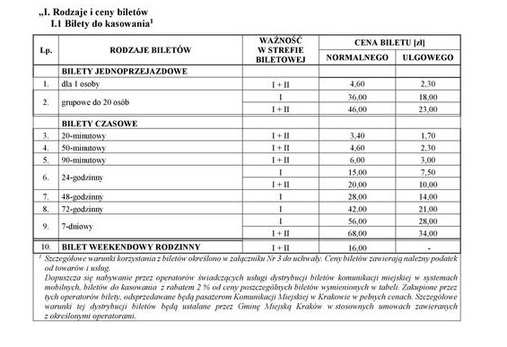 Nowe stawki za korzystanie z komunikacji miejskiej w Krakowie prezentują się następująco (I - strefa miejska, II - strefa podmiejska):