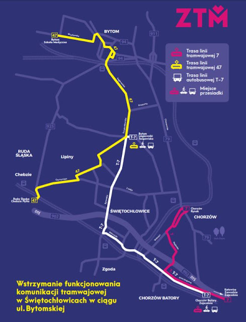 - uruchomiona będzie zastępcza, tramwajowa LINIA 47, na trasie Bytom Szkoła Medyczna - Łagiewniki Targowisko - Chebzie Pętla, kursująca z częstotliwością 15 minut w dni powszednie i 30 w dni wolne, w zastępstwie za linie 7, 17 i 46 na terenie Bytomia i Świętochłowic,