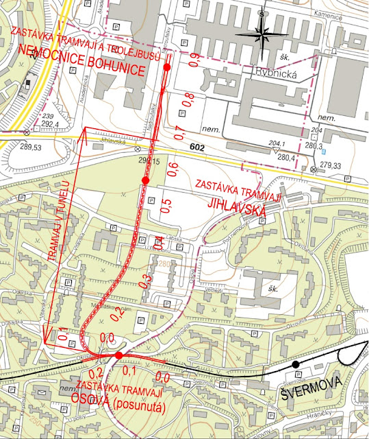 Umowę na realizację trasy podpisano 26 czerwca z firmą Metrostav z Pragi. Większa część trasy będzie przebiegała pod ziemią, gdzie w tunelu o długości 619 metrów zaplanowano powstanie przystanku Nova Jihlavska. Tunel przebiegać będzie pod placem Mikołaja, na głębokości 6-11 metrów. Końcowym przystankiem będzie Nemocnice Bohunice, który znajdzie się już na powierzchni. Będzie on urządzony w formie krańca czołowego, wzorem przystanku końcowego Mifkova na Lisieniu.